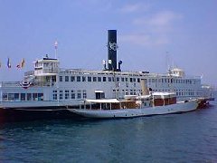The sailing ship is the Star of India, the oldest iron sailing ship that is still sailable, according to the brochures. The ferryboat is the Berkeley, which was operational from 1898 to 1958 in San Francisco Bay. The smaller boat next to the Berkeley is the Medea, a 1904 steam yacht. |
